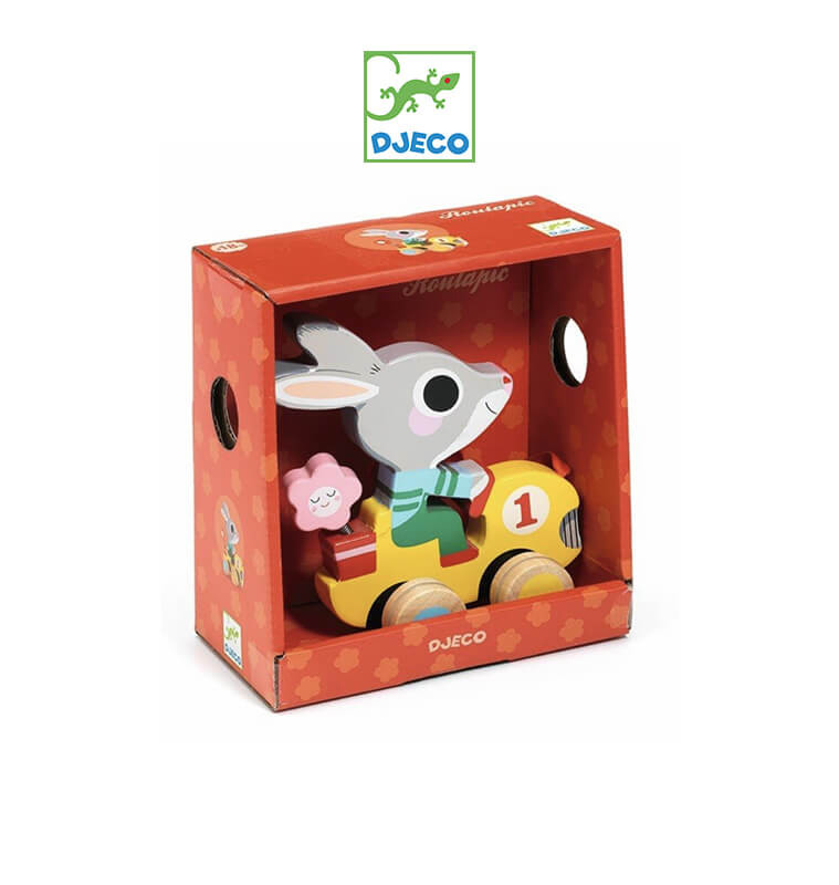 Un joli petit lapin en bois à tirer, monté sur une voiture : il se dandine et s'anime quand on le promène grâce à son ruban. Ses couleurs vives et sa fleur montée sur ressort apportent une touche ludique à ce jouet en bois. Parfait pour accompagner les premiers pas, il stimule la motricité et invite à l'exploration. Recommandé à partir de 18 mois.