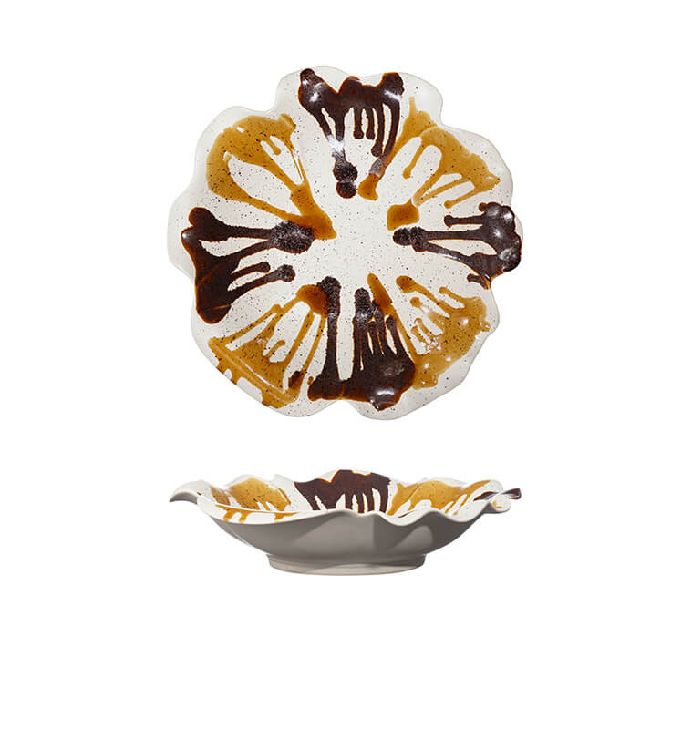 Ce centre de table en céramique séduit par sa forme organique et ses bords ondulés qui apportent du mouvement. Son décor aux nuances marron sur fond crème crée un effet artistique et chaleureux. Idéal pour accueillir des fruits ou en pièce décorative, il habille votre table avec élégance et caractère.