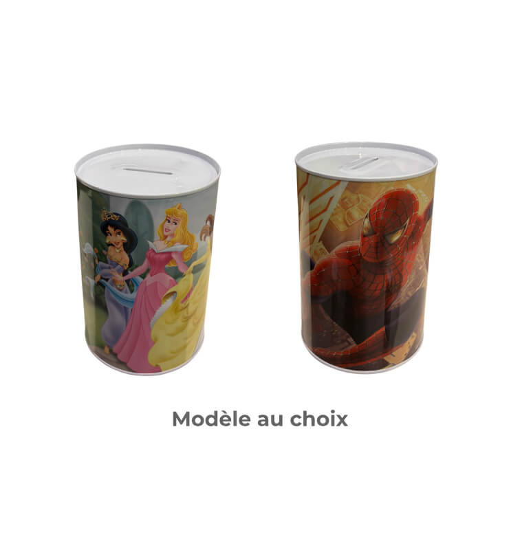 Une tirelire cylindrique de 10 x 15 cm décorée aux couleurs des princesses ou de Spiderman. Idéale pour apprendre à économiser tout en ajoutant une touche de décoration dans la chambre. Sa fente sur le dessus permet de glisser facilement pièces et billets. Modèle selon disponibilité.