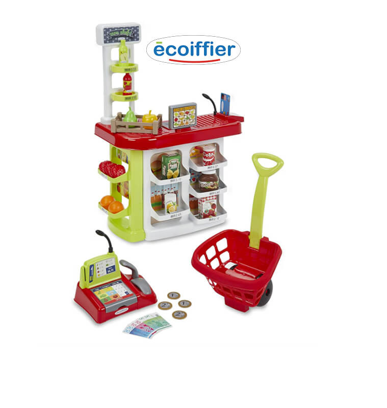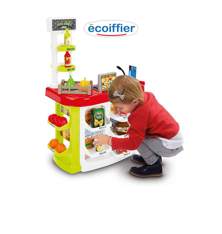 Ce supermarché Ecoiffier est idéal pour rejouer les courses comme les grands. Il comprend une caisse enregistreuse avec scanner, balance, terminal de paiement, panier, pièces, billets et de nombreux produits alimentaires. Grâce à ses étagères bien garnies et ses multiples accessoires, il favorise l'imagination et le jeu de rôle tout en développant la motricité. À partir de 18 mois.