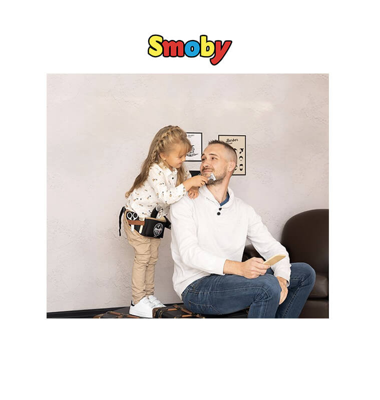Cette ceinture de barbier-coiffeur de la marque Smoby permet à l'enfant de jouer au professionnel du salon dès 3 ans. Elle inclut 10 accessoires : ciseaux, tondeuse mécanique avec 3 longueurs de coupe, pot de soin, rasoir, miroir, sèche-cheveux électronique à fonctions sonores et lumineuses, flacon de mousse, peigne et blaireau. La sangle de la ceinture est réglable pour s'adapter à l'enfant, et le design global favorise l'imagination, le jeu d'imitation et le développement de la motricité fine.