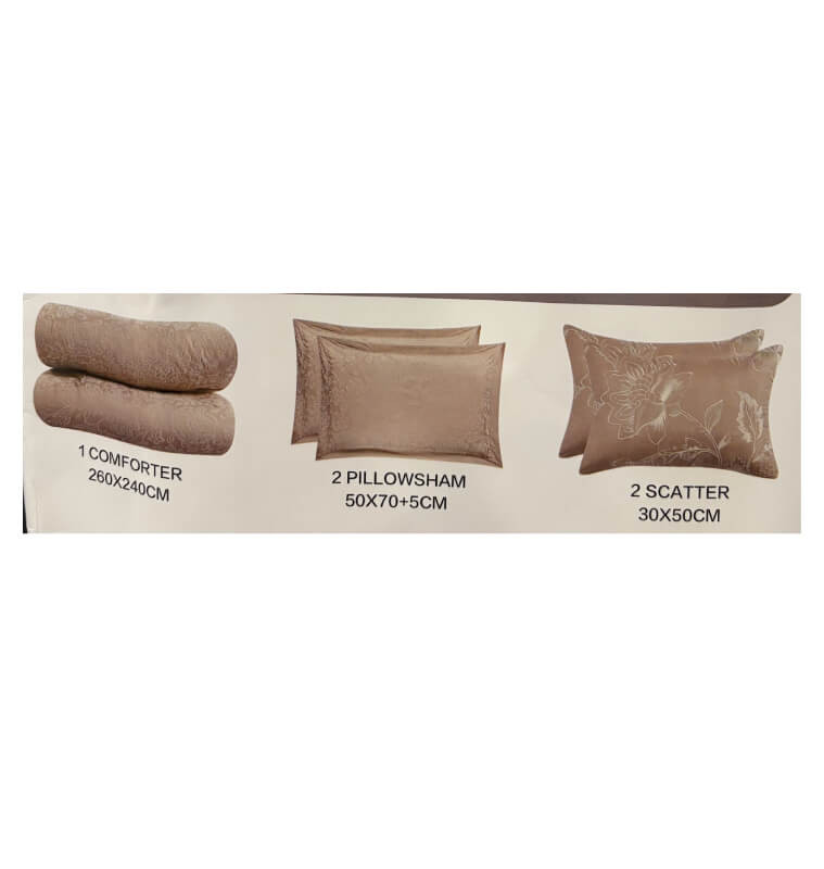 Apportez une atmosphère douce et raffinée à votre chambre avec ce comforter set 5 pièces jacquard coloris beige. Sa couette 240 x 260 cm au garnissage 200 GSM offre un confort agréable tout en habillant le lit avec élégance. L’ensemble comprend deux taies d’oreiller 50 x 70 cm et deux coussins décoratifs 30 x 50 cm, parfaits pour créer une décoration harmonieuse. Son tissu polyester 85 GSM est léger, pratique et facile à entretenir au quotidien.