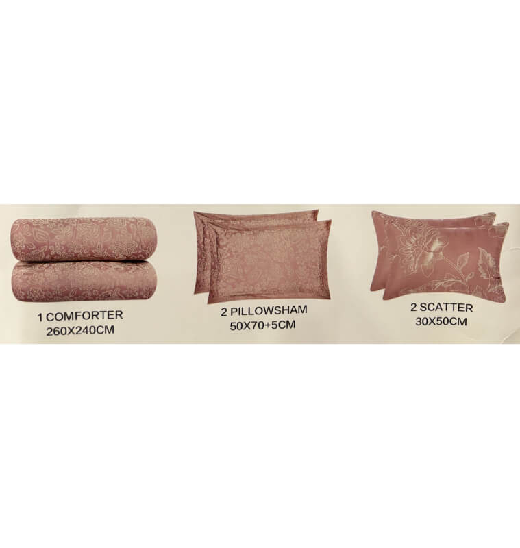 Apportez une note douce et contemporaine à votre chambre avec ce comforter set 5 pièces jacquard coloris pink. Sa couette 240 x 260 cm au garnissage 200 GSM assure un confort agréable tout en valorisant le lit avec élégance. L’ensemble inclut deux taies d’oreiller 50 x 70 cm et deux coussins décoratifs 30 x 50 cm. Son tissu polyester 85 GSM est léger et facile à entretenir, idéal pour une ambiance cosy et lumineuse.