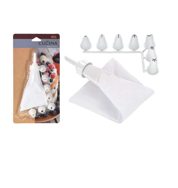 Réalisez des décorations pâtissières dignes d'un professionnel avec cette poche à douille complète La Cucina. Le kit inclut 8 douilles interchangeables aux formes variées pour créer des rosaces, étoiles, rubans et bien d'autres motifs sur vos gâteaux, cupcakes et biscuits. La poche souple et résistante est facile à remplir et à manipuler pour un résultat précis et maîtrisé. Idéale aussi bien pour les débutants que les pâtissiers confirmés, elle transforme chaque préparation en véritable œuvre gourmande.