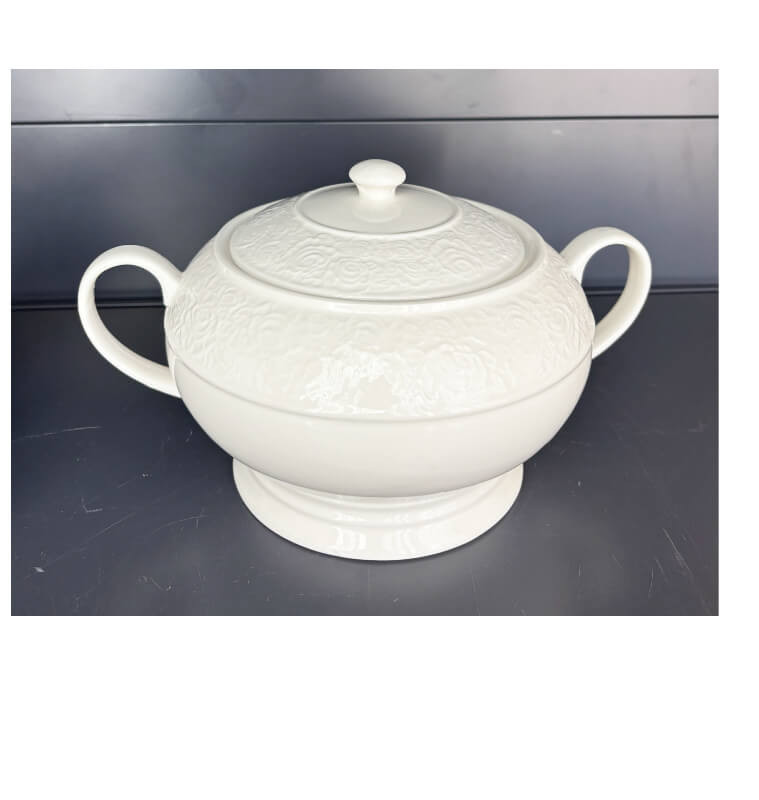 Servez vos soupes et plats mijotés avec élégance grâce à cette soupière en porcelaine blanche au motif floral en relief. Ses deux anses latérales facilitent la prise en main et le service à table, tandis que son couvercle à pomme maintient les plats au chaud. Son décor arabesque en relief tout blanc lui confère un charme classique et raffiné, digne des plus belles tables.