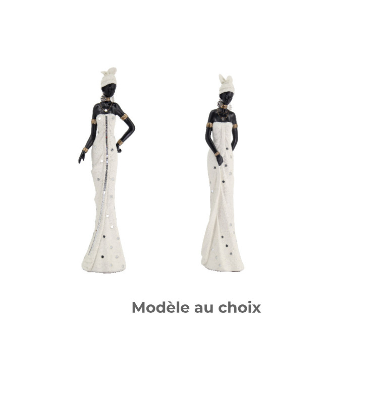 Statuette décorative représentant une femme africaine vêtue d’une élégante robe blanche, sublimée par des détails raffinés et des accessoires délicats. D’une hauteur de 39,5 cm, sa silhouette élancée apporte une touche chic et lumineuse à la décoration intérieure. Disponible en plusieurs modèles, cette pièce s’intègre facilement dans un salon, une entrée ou une chambre, pour une ambiance à la fois élégante et authentique.