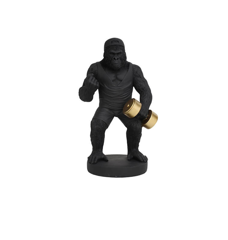 Statuette décorative représentant un gorille noir tenant un haltère doré, symbole de puissance et de détermination. Son contraste de couleurs apporte une touche moderne et originale à un salon, un bureau ou une étagère. Un objet déco au style affirmé qui attire immédiatement le regard.