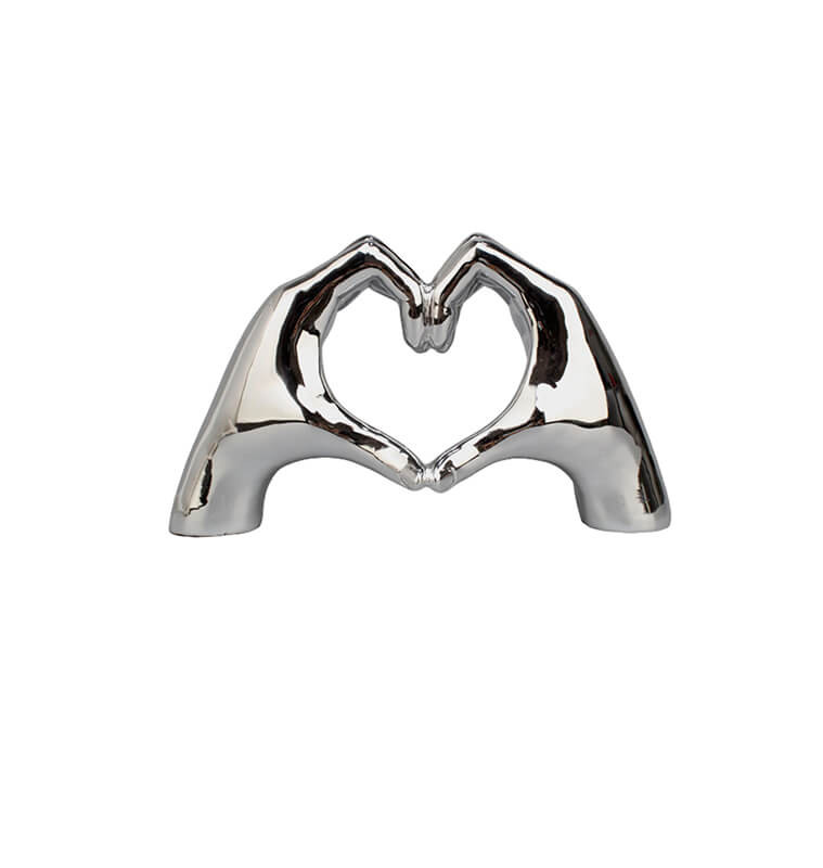 Statuette décorative représentant deux mains formant un cœur, avec une finition argent brillante. Son design épuré et symbolique apporte une touche élégante et moderne à une étagère, une table ou un bureau. Un bel objet déco qui évoque l’amour et l’harmonie dans votre intérieur.