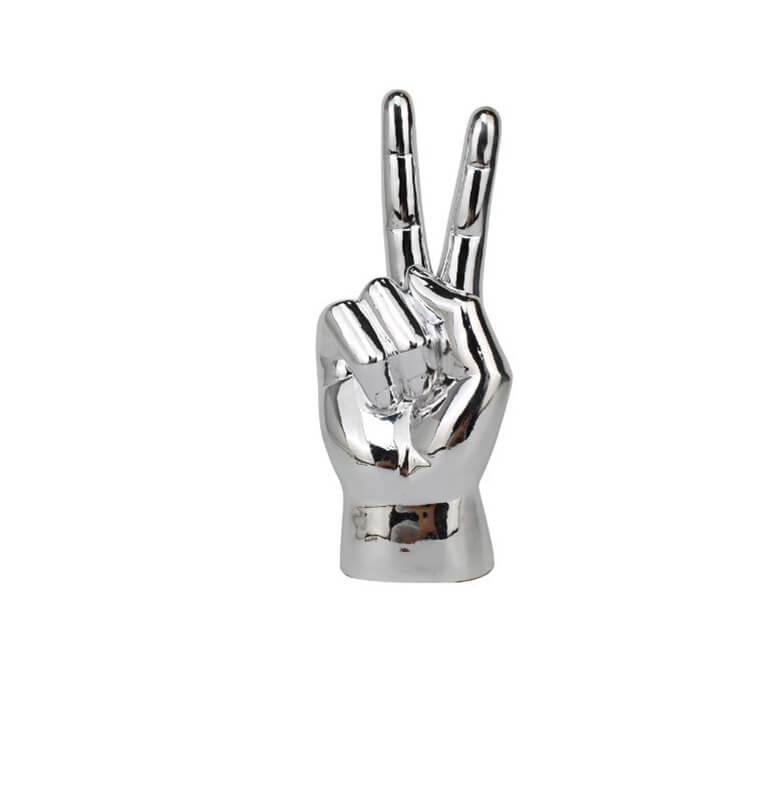 Statuette décorative représentant une main faisant le signe de la victoire, avec une finition argent brillante. Son design moderne et symbolique apporte une touche contemporaine et positive à un salon, un bureau ou une étagère. Un objet déco original qui attire le regard et dynamise l’espace.