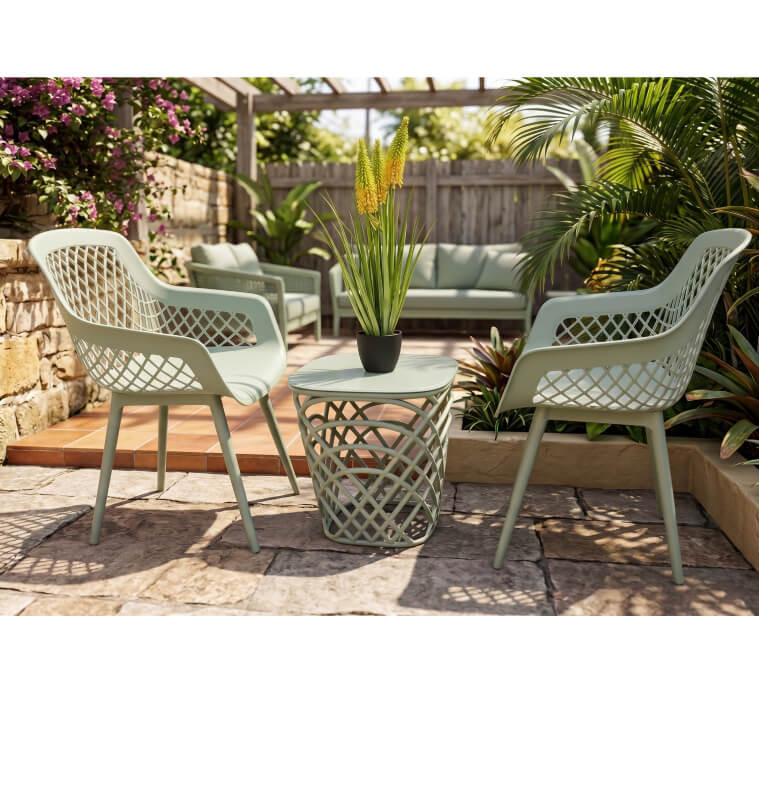 Conçu en polypropylène (PP) traité anti-UV, cet ensemble est résistant aux conditions extérieures et facile à entretenir. Les chaises au design ajouré offrent une assise confortable, tandis que la table d’appoint est idéale pour vos boissons ou petits objets du quotidien.
