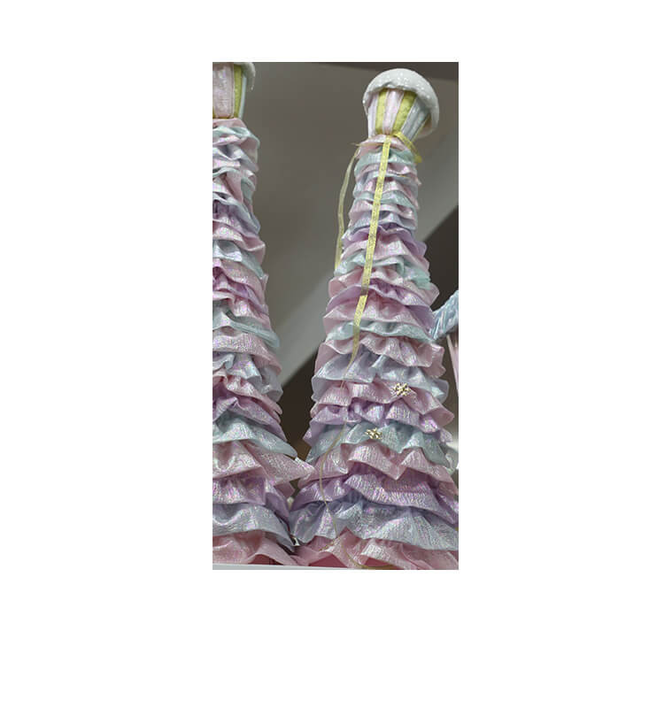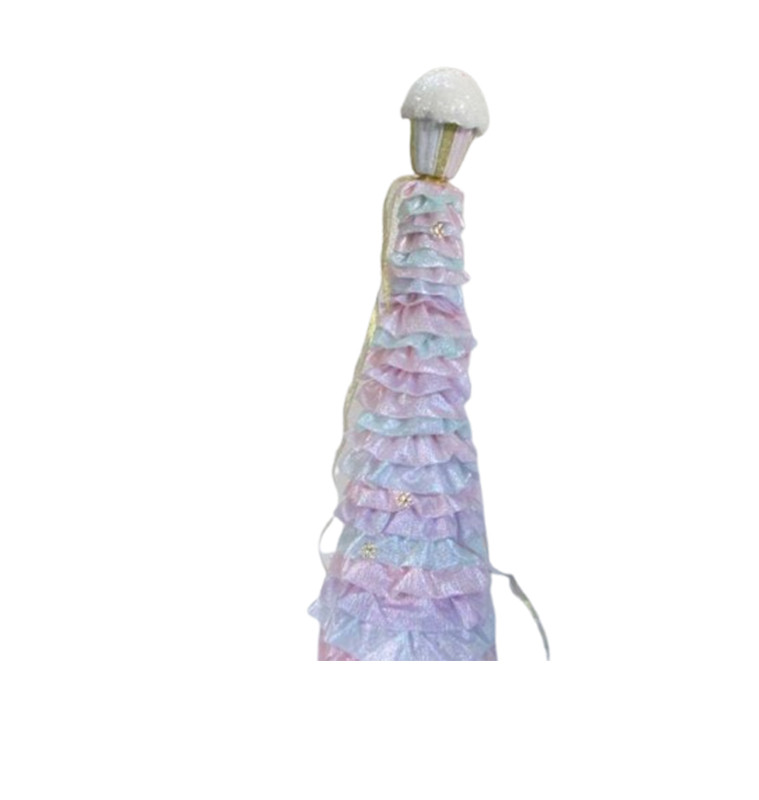 Un sapin tout en tissu, composé de volants pastel scintillants et surmonté d’un petit cupcake. Une pièce originale et pleine de douceur, idéale pour apporter une touche festive et gourmande à votre décoration de Noël.
