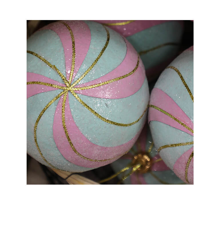 Une grande boule de Noël pastel aux rayures scintillantes. Parfaite pour enrichir votre déco gourmande : à suspendre au sapin, à accrocher à une poignée de porte ou à intégrer dans une composition festive pour apporter douceur et fantaisie à votre ambiance de Noël.