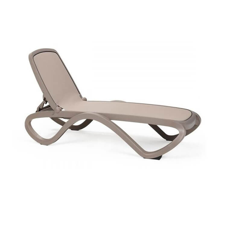 Un transat taupe qui mesure 69x194.5x91, sans accoudoirs, parfait pour chiller au soleil !