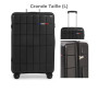 Robuste, élégante et certifiée, cette grande valise trolley rigide est conçue pour les voyageurs qui n'acceptent aucun compromis sur la qualité. Sa coque noire mate au design en relief quadrillé lui confère un aspect premium, tandis que ses 4 roues pivotantes à 360° assurent une mobilité parfaite même chargée à bloc. Ce qui la distingue vraiment : elle a subi un contrôle qualité international en 6 étapes avant d'arriver entre vos mains, tests de chocs, de chute, d'escaliers, de poignée, de roulage et de température inclus. Vous voyagez avec une valise qui a tout prouvé. Grande capacité idéale pour les longs séjours | Design quadrillé moderne et robuste | Coque rigide noire, résistante aux chocs et aux rayures